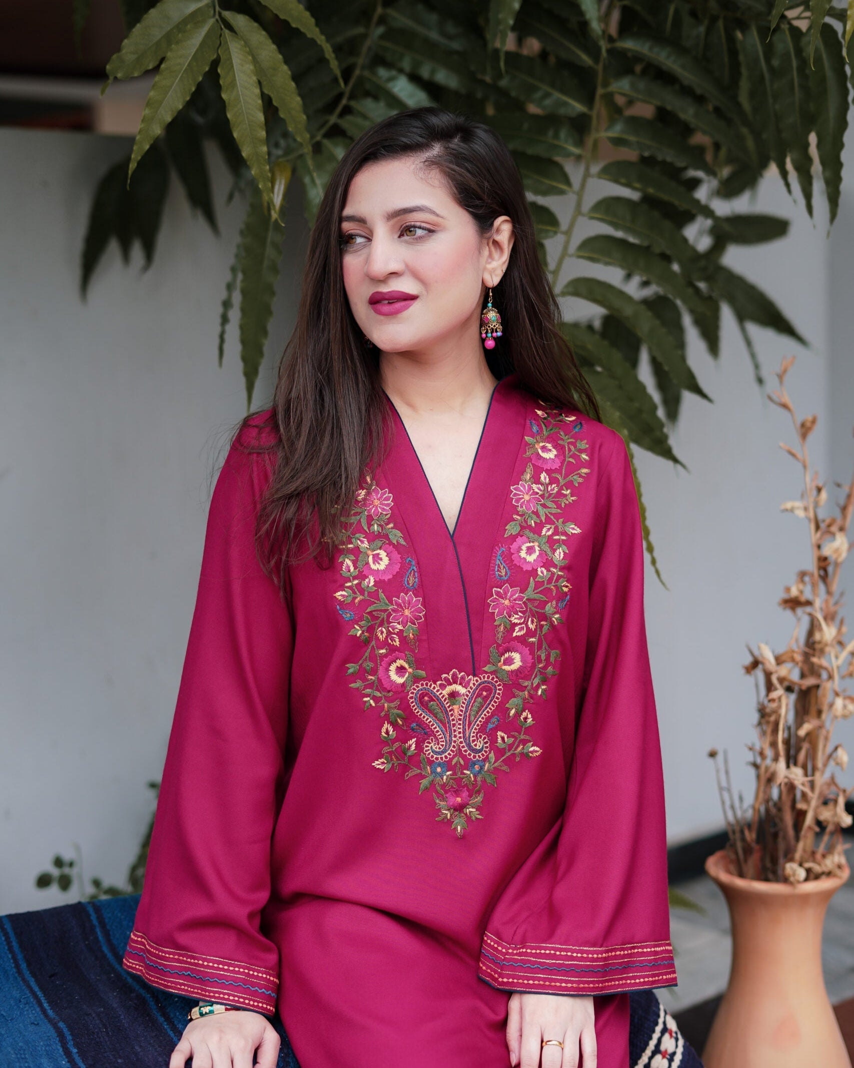 An embroidered deep pink kurta with Kashmiri style multi-coloured resham embroidery on the neckline along with embroidered sleeves border. It's a 2 piece set in the wool marina (marina with a blend of woollen thread). The kurta is paired with straight pants to complete the look.