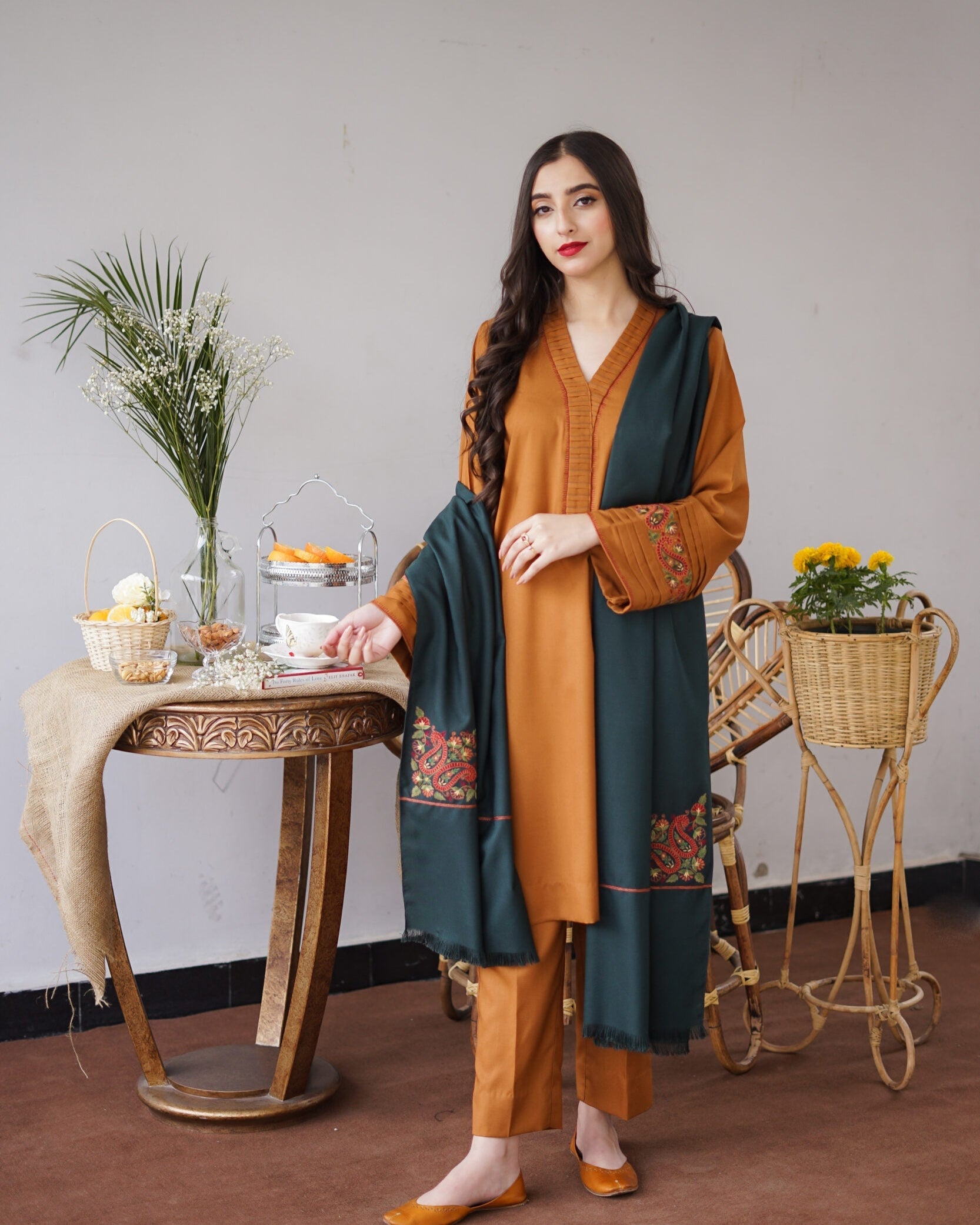 Deep caramel straight kurta in mareena with multi coloured paisely and floral inspired motif embroidery on sleeves; adorned with pleats and fabrication details. Paired with matching straight pants and contrast teal green shawl with paisely embroidered motifs on four sides.